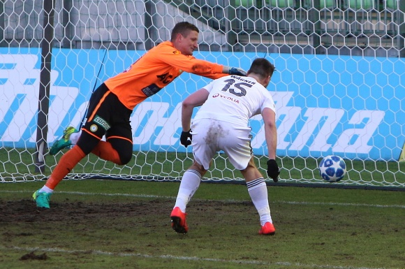 Těsně před poločasovým hvizdem už to vyšlo. Rohový kop někdo z hloučku hráčů na přední tyči prodloužil na osamoceného Tomáše Wágnera, který neměl příliš práce poslat míč hlavou do sítě – 1:0! Wágner se tak trefil na jaře už podruhé a jsou to jediné karvinské góly.