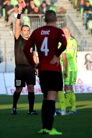 Klíčový moment celého utkání přišel krátce před pauzou. Nevinně vypadající střet Budínského s Vatajeluem nejprve vyhodnotil hlavní rozhodčí za žlutou kartu, ovšem po zhlédnutí videa svůj verdikt opravil a udělil aktuálně nejlepšímu karvinskému střelci přímou červenou kartu. V nastaveném čase drsně fauloval Pulkrab záložníka Ba Loua, ovšem jen za žlutou kartu. Starosti si ještě přidělal Martin Berkovec, když nezachytil jednoduchý balón, po kterém vznikl velký závar, ale domácí to přežili bez úhony.